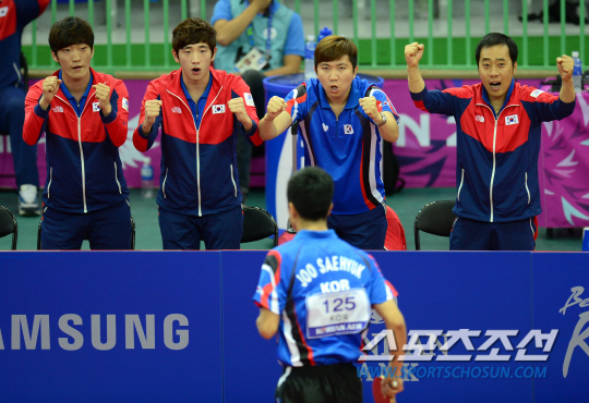 인천아시안게임 탁구 남자 단체전 한국(주세혁, 정상은, 이정우, 김동현)과 중국(쉬신, 판전둥, 마룽, 장지커)의 결승전이 30일 수원실내체육관에서 열렸다. 첫 번째 게임에서 주세혁이 마룽과 대결에서 득점을 하자 벤치의 감독과 선수들이 환호하고 있다.