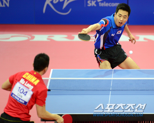 인천아시안게임 탁구 남자 단체전 한국(주세혁, 정상은, 이정우, 김동현)과 중국(쉬신, 판전둥, 마룽, 장지커)의 결승전이 30일 수원실내체육관에서 열렸다. 첫 번째 게임에서 주세혁이 마룽과 대결을 펼치고 있다.