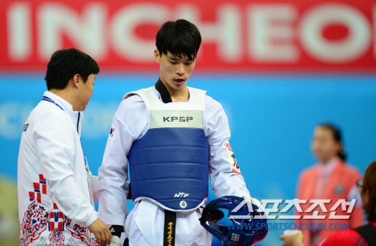 30일 인천 강화 고인돌체육관에서 2014 인천아시아경기대회 태권도 경기가 열렸다. 남자 -74kg급에 출전한 송영건이 4강전에서 우즈베키스탄 라파로비치와 대결을 펼쳤다. 패배한 송영건이 아쉬운 표정을 짓고 있다.