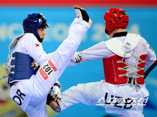 30일 인천 강화 고인돌체육관에서 2014 인천아시아경기대회 태권도 경기가 열렸다. 남자 -74kg급에 출전한 송영건이 4강전에서 우즈베키스탄 라파로비치와 대결을 펼쳤다. 발차기 공격을 시도하고 있는 송영건(왼쪽).