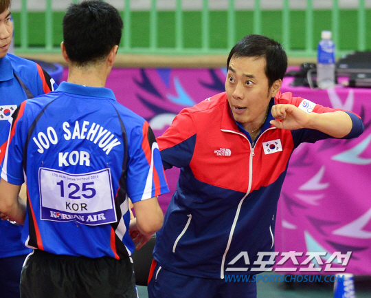 인천아시안게임 탁구 남자 단체전 한국(주세혁, 정상은, 이정우, 김동현)과 중국(쉬신, 판전둥, 마룽, 장지커)의 결승전이 30일 수원실내체육관에서 열렸다. 첫 번째 게임에서 주세혁이 마룽과 대결을 펼치는 가운데 유남규 감독이 작전지시를 하고 있다.