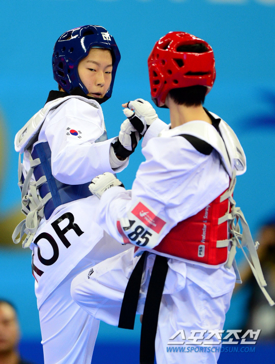 30일 인천 강화 고인돌체육관에서 2014 인천아시아경기대회 태권도 경기가 열렸다. 여자 -53kg급에 출전한 윤정연이 4강전에서 경기를 펼쳤다. 윤정연은 중국의 강호 우징위를 6대 4로 꺾고 결승에 진출했다. 강력한 발차기를 선보이는 윤정연(왼쪽).