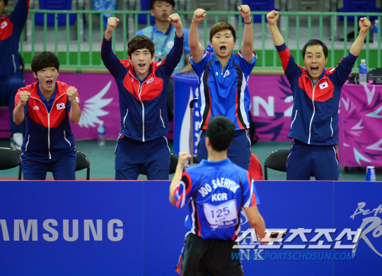 인천아시안게임 탁구 남자 단체전 한국(주세혁, 정상은, 이정우, 김동현)과 중국(쉬신, 판전둥, 마룽, 장지커)의 결승전이 30일 수원실내체육관에서 열렸다. 첫 번째 게임에서 주세혁이 마룽과 대결을 펼친 가운데 3세트를 따내자 벤치의 감독, 코치, 선수들이 환호하고 있다.