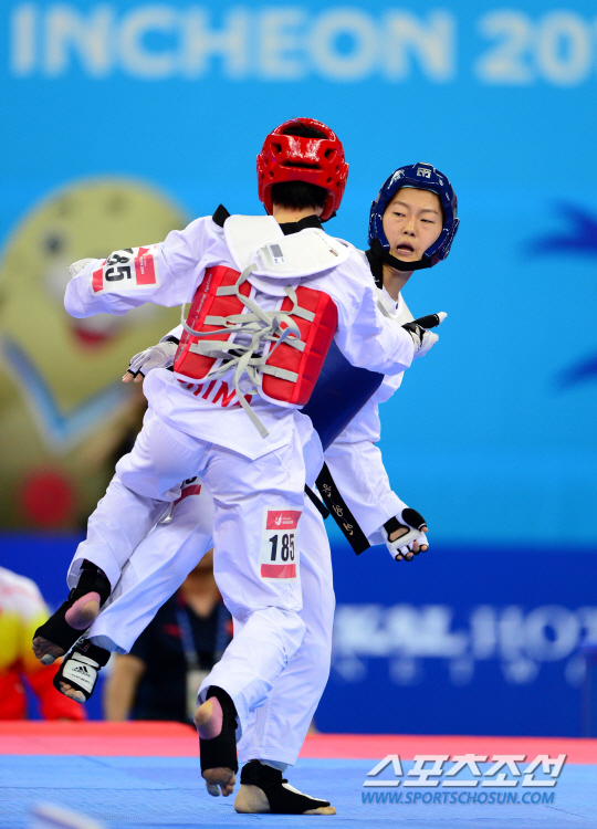 30일 인천 강화 고인돌체육관에서 2014 인천아시아경기대회 태권도 경기가 열렸다. 여자 -53kg급에 출전한 윤정연이 4강전에서 경기를 펼쳤다. 윤정연은 중국의 강호 우징위를 6대 4로 꺾고 결승에 진출했다. 강력한 발차기를 선보이는 윤정연(오른쪽).