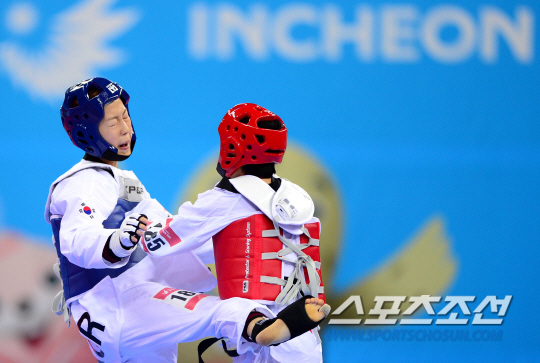 30일 인천 강화 고인돌체육관에서 2014 인천아시아경기대회 태권도 경기가 열렸다. 여자 -53kg급에 출전한 윤정연이 4강전에서 경기를 펼쳤다. 윤정연은 중국의 강호 우징위를 6대 4로 꺾고 결승에 진출했다. 강력한 발차기를 선보이는 윤정연(왼쪽).