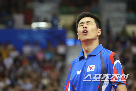 인천아시안게임 탁구 남자 단체전 한국(주세혁, 정상은, 이정우, 김동현)과 중국(쉬신, 판전둥, 마룽, 장지커)의 결승전이 30일 수원실내체육관에서 열렸다. 첫 번째 게임에서 주세혁이 마룽과 대결을 펼친 가운데 실점을 하자 아쉬워하고 있다.
