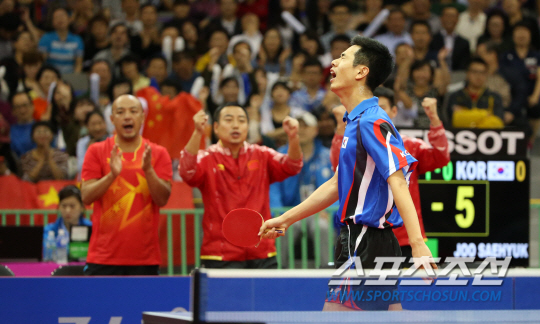 인천아시안게임 탁구 남자 단체전 한국(주세혁, 정상은, 이정우, 김동현)과 중국(쉬신, 판전둥, 마룽, 장지커)의 결승전이 30일 수원실내체육관에서 열렸다. 첫 번째 게임에서 주세혁이 마룽과 대결을 펼친 가운데 실점을 하자 아쉬워하고 있다.