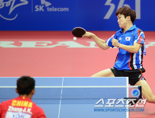 인천아시안게임 탁구 남자 단체전 한국(주세혁, 정상은, 이정우, 김동현)과 중국(쉬신, 판전둥, 마룽, 장지커)의 결승전이 30일 수원실내체육관에서 열렸다. 세 번째 게임에서 정상은이 장지커와 대결을 펼치고 있다.