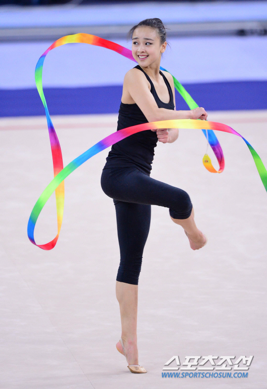 30일 오후 인천 남동체육관에서 2014 인천 아시안게임 한국 리듬체조 선수들의 훈련이 열렸다. 손연재가 리본 연기를 하고 있다.