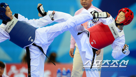 30일 인천 강화 고인돌체육관에서 2014 인천아시아경기대회 태권도 경기가 열렸다. 여자 -53kg급에 출전한 윤정연이 결승전에서 대만의 황윈원과 금메달을 두고 한판 승부를 펼쳤다. 황윈원에게 강력한 발차기 공격을 하고 있는 윤정연(오른쪽).