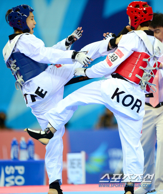 30일 인천 강화 고인돌체육관에서 2014 인천아시아경기대회 태권도 경기가 열렸다. 여자 -53kg급에 출전한 윤정연이 결승전에서 대만의 황윈원과 금메달을 두고 한판 승부를 펼쳤다. 황윈원에게 강력한 발차기 공격을 당하고 있는 윤정연(오른쪽).