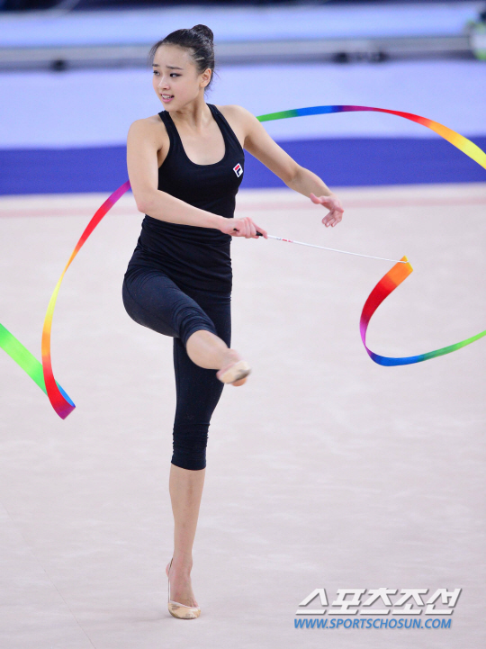 30일 오후 인천 남동체육관에서 2014 인천 아시안게임 한국 리듬체조 선수들의 훈련이 열렸다. 손연재가 리본 연기를 하고 있다.