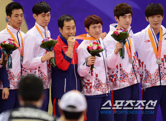 인천아시안게임 탁구 남자 단체전 한국(주세혁, 정상은, 이정우, 김동현, 김민석)과 중국(쉬신, 판전둥, 마룽, 장지커)의 결승전이 30일 수원실내체육관에서 열렸다. 중국에 0-3으로 패한 한국 선수들이 시상식에서 은메달을 목에 걸었다. 유남규 감독과 유승민 코치가 함께 기념촬영을 하고 있다.