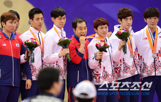 인천아시안게임 탁구 남자 단체전 한국(주세혁, 정상은, 이정우, 김동현, 김민석)과 중국(쉬신, 판전둥, 마룽, 장지커)의 결승전이 30일 수원실내체육관에서 열렸다. 중국에 0-3으로 패한 한국 선수들이 시상식에서 은메달을 목에 걸었다. 유남규 감독과 유승민 코치가 함께 기념촬영을 하고 있다.