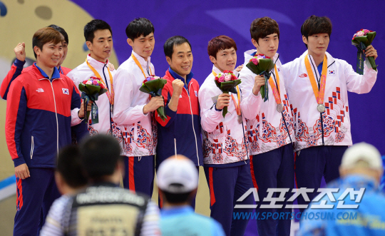 인천아시안게임 탁구 남자 단체전 한국(주세혁, 정상은, 이정우, 김동현, 김민석)과 중국(쉬신, 판전둥, 마룽, 장지커)의 결승전이 30일 수원실내체육관에서 열렸다. 중국에 0-3으로 패한 한국 선수들이 시상식에서 은메달을 목에 걸었다. 유남규 감독과 유승민 코치가 함께 기념촬영을 하고 있다.
