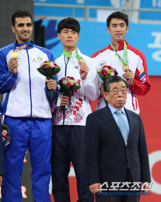 30일 인천 강화 고인돌체육관에서 2014 인천아시아경기대회 태권도 경기가 열렸다. 남자 -74kg급에서 동메달을 차지한 송영건이 시상식에서 포즈를 취하고 있다. 김운용 대한태권도협회 (명예회장)이 함께 포즈를 취하고 있다.