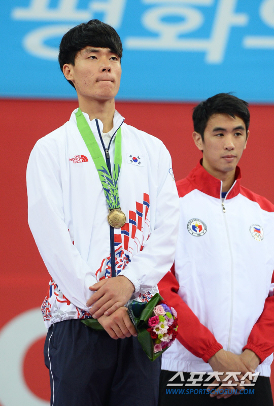 30일 인천 강화 고인돌체육관에서 2014 인천아시아경기대회 태권도 경기가 열렸다. 남자 -74kg급에서 동메달을 차지한 송영건이 시상식에서 포즈를 취하고 있다.