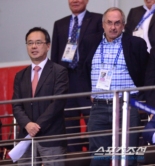 30일 오후 인천 문학경기장에서 2014 인천 아시안게임 축구 남자 4강 한국과 태국의 경기가 열렸다. 슈틸리케 A대표팀 감독이 이용수 기술위원장과 경기를 관전하고 있다.