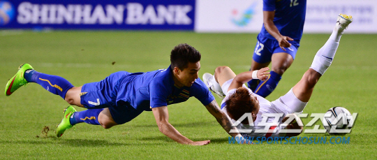 30일 오후 인천 문학경기장에서 2014 인천 아시안게임 축구 남자 4강 한국과 태국의 경기가 열렸다. 한국 손준호가 태국의 반칙에 넘어지고 있다.
