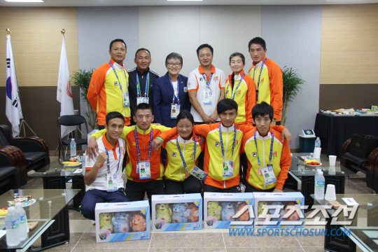 이에리사 인천아시안게임 선수촌장이 28일, 출국을 앞둔 부탄 선수단 전원에게 '물범 3남매(비추온, 바라메, 추므로)' 인형세트를 선물했다.