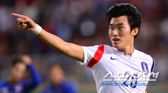30일 오후 인천 문학경기장에서 2014 인천 아시안게임 축구 남자 4강 한국과 태국의 경기가 열렸다. 전반 한국의 두번째 골을 성공시킨 장현수가 환호하고 있다.