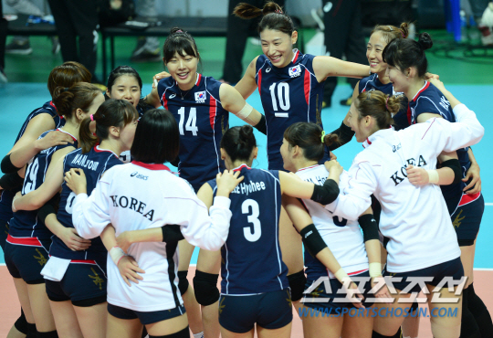 인천아시안게임 여자배구 한구과 일본의 준결승전이 30일 안산 상록수체육관에서 열렸다. 한국이 일본을 3-0으로 꺾으며 결승에 진출한 가운데 김연경이 동료들과 어깨동무를 한 채 기쁨을 만끽하고 있다.