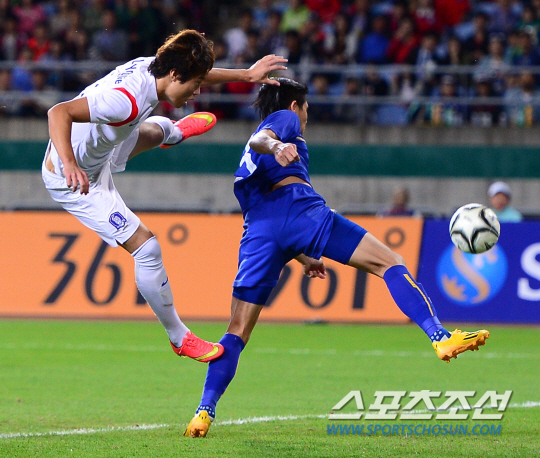 30일 오후 인천 문학경기장에서 2014 인천 아시안게임 축구 남자 4강 한국과 태국의 경기가 열렸다. 한국 이용재가 슈팅을 시도하고 있다.