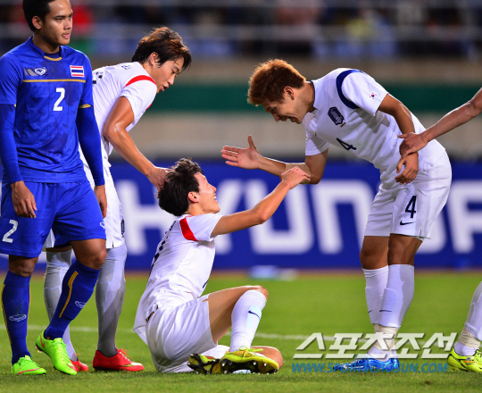 30일 오후 인천 문학경기장에서 2014 인천 아시안게임 축구 남자 4강 한국과 태국의 경기가 열렸다. 전반 페널티킥을 얻어낸 한국 이재성(가운데)이 김민혁과 기뻐하고 있다.