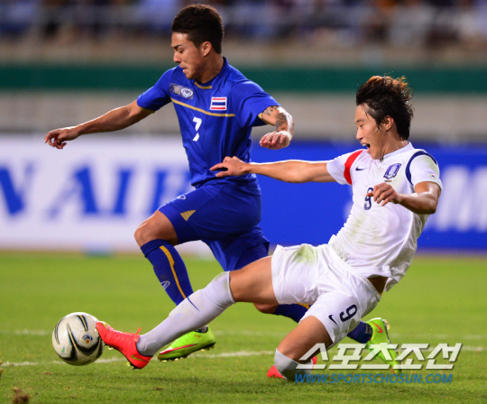 30일 오후 인천 문학경기장에서 2014 인천 아시안게임 축구 남자 4강 한국과 태국의 경기가 열렸다. 한국 이용재가 볼을 다투고 있다.