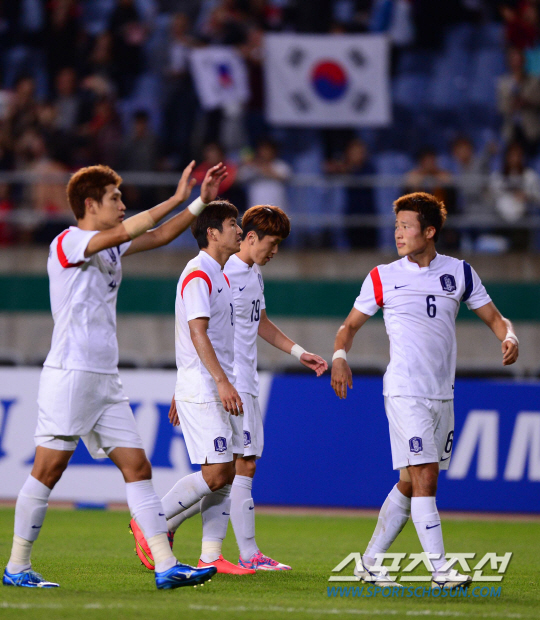30일 오후 인천 문학경기장에서 2014 인천 아시안게임 축구 남자 4강 한국과 태국의 경기가 열렸다. 2대0으로 승리하며 결승행이 확정된 후 한국 선수들이 관중들에게 인사하고 있다.