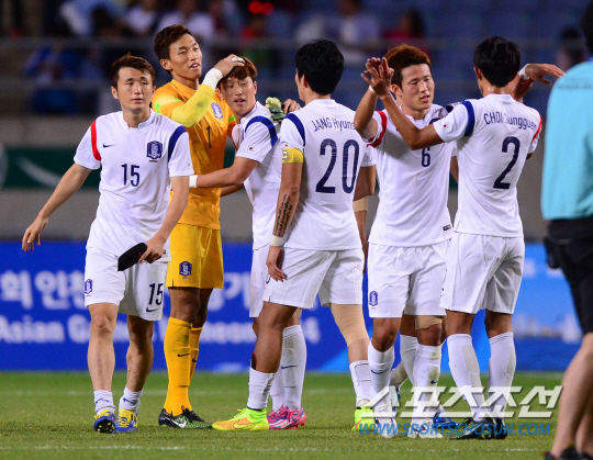 30일 오후 인천 문학경기장에서 2014 인천 아시안게임 축구 남자 4강 한국과 태국의 경기가 열렸다. 2대0으로 승리하며 결승행이 확정된 후 한국 선수들이 기뻐하고 있다.