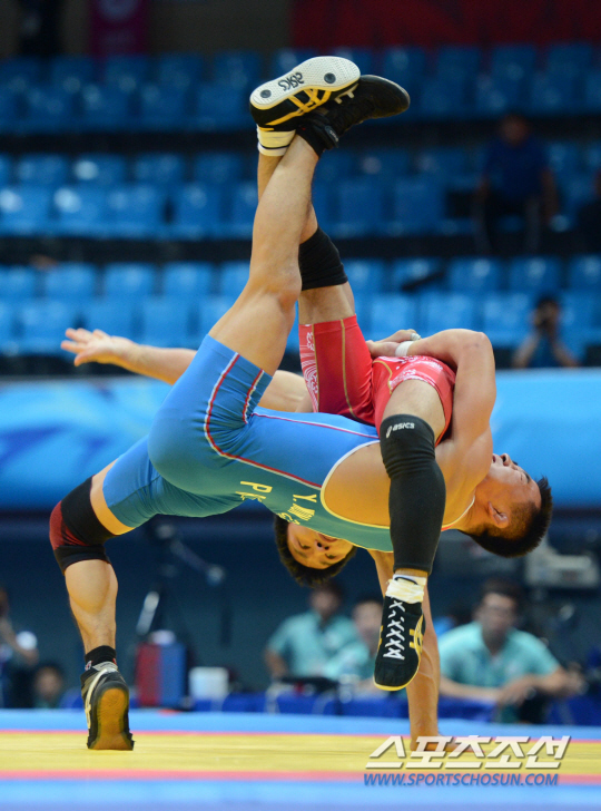 북한레슬링대표팀 윤원철이 30일 인천 도원체육관에서 열린 2014인천아시안게임 남자유도 그레코로만형 59kg급 결승전전에서 일본의 하세가와 코헤이와 대결을 펼치고 있다. 인천=최문영 기자 deer@sportschosun.com
