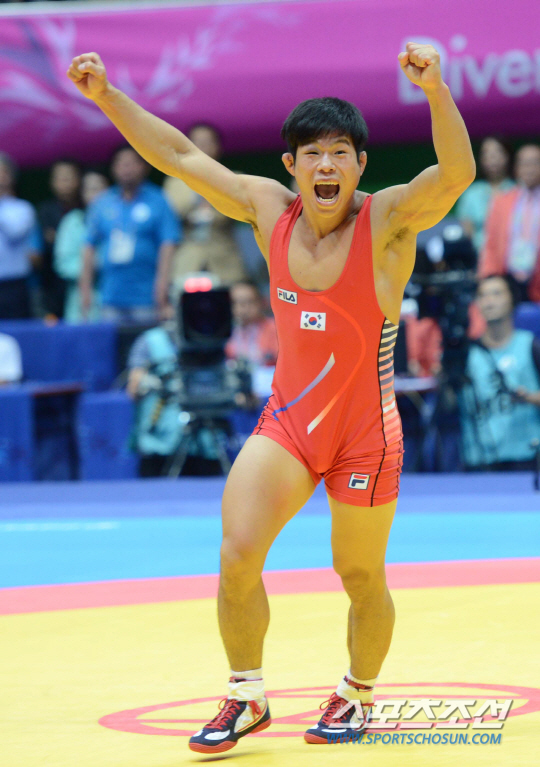 한국레슬링대표팀 정지현이 30일 인천 도원체육관에서 열린 2014인천아시안게임 남자유도 그레코로만형 71kg급 결승전에서 우즈베키스탄의 투르디에프를 폴승으로 이기고 포효하고 있다. 인천=최문영 기자 deer@sportschosun.com /2014.09.30/