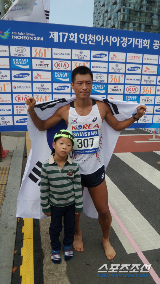 아들 순남군(7)을 안고 포즈를 취한 박칠성은 "재기를 위해 1년 반동안 아시안게임만 바라봤다"면서 "목표는 금메달이었지만 아직은 은메달밖에 되지 않는다"고 말했다. 그는 "다음 목표는 내년 중국 베이징에서 열리는 세계육상선수권대회라며 자세와 지구력을 보완해 50㎞ 경보에서도 해낼 수 있다는 것을 좋은 성적으로 증명해 보이겠다"고 다짐했다. 인천=이 건 기자 bbadagun@sportschosun.com
