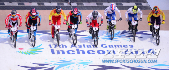 1일 오전 인천 강화아시아드 BMX 경기장에서 2014 인천 아시안게임 사이클 BMX 남자 모토스 경기가 열렸다. 각국 선수들이 힘차게 달리고 있다.