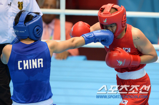 인천아시안게임 복싱 여자 60KG급 한국 박진아와 중국 인쥔화의 결승전이 1일 인천 선학체육관에서 열렸다. 박진아가 중국 인쥔화의 안면 스트레이트 공격을 허용하고 있다.