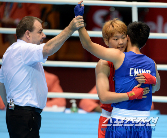 인천아시안게임 복싱 여자 60KG급 한국 박진아와 중국 인쥔화의 결승전이 1일 인천 선학체육관에서 열렸다. 경기 후 판정에서 심판이 인쥔화의 손을 들고 있다. 박진아와 인쥔화가 포옹을 하고 있다.