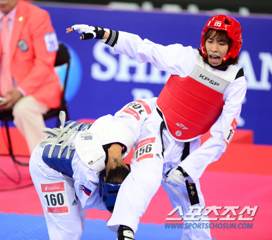 1일 오후 인천 강화고인돌경기장에서 2014 인천 아시안게임 태권도 여자 46kg 4강전 한국 김소희와 필리핀 피라즈의 경기가 열렸다. 한국 김소희가 내려찍기를 성공시키고 있다.