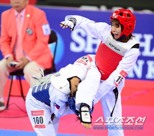 1일 오후 인천 강화고인돌경기장에서 2014 인천 아시안게임 태권도 여자 46kg 4강전 한국 김소희와 필리핀 피라즈의 경기가 열렸다. 한국 김소희가 내려찍기를 성공시키고 있다.