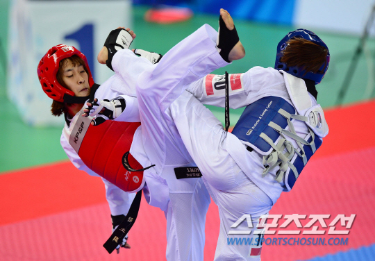 1일 오후 인천 강화고인돌경기장에서 2014 인천 아시안게임 태권도 여자 46kg 4강전 한국 김소희와 필리핀 피라즈의 경기가 열렸다. 한국 김소희가 공격을 시도하고 있다.