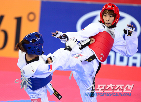 1일 오후 인천 강화고인돌경기장에서 2014 인천 아시안게임 태권도 여자 46kg 4강전 한국 김소희와 필리핀 피라즈의 경기가 열렸다. 한국 김소희가 공격을 시도하고 있다.