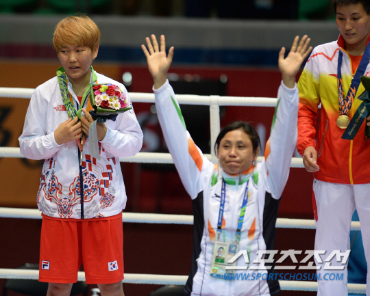 인천아시안게임 복싱 여자 75KG급 북한 장은희와 중국 리퀴안의 결승전이 1일 인천 선학체육관에서 열렸다. 박진아가 은메달을 딴 가운데 시상식이 열렸다. 준결승에서 박진아에 패하며 판정에 불만을 표시했던 인도 사리타 데비가 자신이 받은 동메달을 박진아에게 걸어준 후 손을 흔들고 있다.