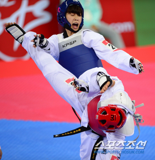 1일 오후 인천 강화고인돌경기장에서 2014 인천 아시안게임 태권도 여자 57kg 4강전 한국 이아름과 태국 니사이솜의 경기가 열렸다. 한국 이아름이 공격을 시도하고 있다.