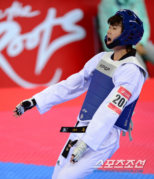 1일 오후 인천 강화고인돌경기장에서 2014 인천 아시안게임 태권도 여자 57kg 4강전 한국 이아름과 태국 니사이솜의 경기가 열렸다. 공격을 성공시킨 한국 이아름이 환호하고 있다.