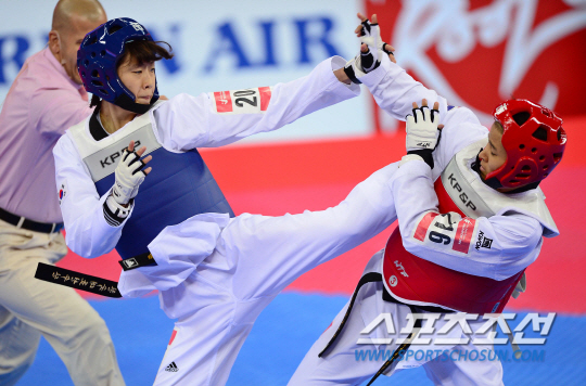 1일 오후 인천 강화고인돌경기장에서 2014 인천 아시안게임 태권도 여자 57kg 4강전 한국 이아름과 태국 니사이솜의 경기가 열렸다. 한국 이아름이 공격을 시도하고 있다.