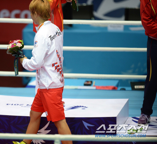 인천아시안게임 복싱 여자 75KG급 북한 장은희와 중국 리퀴안의 결승전이 1일 인천 선학체육관에서 열렸다. 박진아가 은메달을 딴 가운데 시상식이 열렸다. 준결승에서 박진아에 패하며 판정에 불만을 표시했던 인도 사리타 데비가 자신이 받은 동메달을 박진아에게 걸어주는 돌발상황이 발생했다. 박진아가 다시 메달을 돌려주려 했지만 사리타 데비는 거절했고 박진아는 어쩔 수 없이 메달을 바닥에 내려놓고 있다.