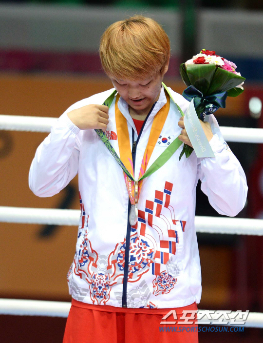 인천아시안게임 복싱 여자 75KG급 북한 장은희와 중국 리퀴안의 결승전이 1일 인천 선학체육관에서 열렸다. 박진아가 은메달을 딴 가운데 시상식이 열렸다. 준결승에서 박진아에 패하며 판정에 불만을 표시했던 인도 사리타 데비가 자신이 받은 동메달을 박진아에게 걸어주는 돌발상황이 발생했다. 박진아가 메달을 돌려주기 위해 벗고 있다.