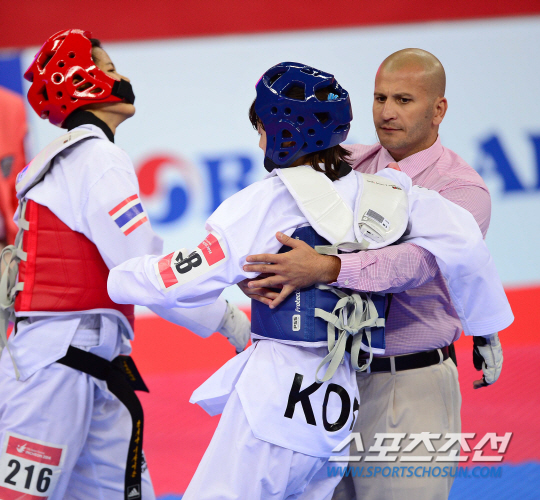 1일 오후 인천 강화고인돌경기장에서 2014 인천 아시안게임 태권도 여자 57kg 4강전 한국 이아름과 태국 니사이솜의 경기가 열렸다. 주심이 한국 이아름의 공격을 제지하고 있다.
