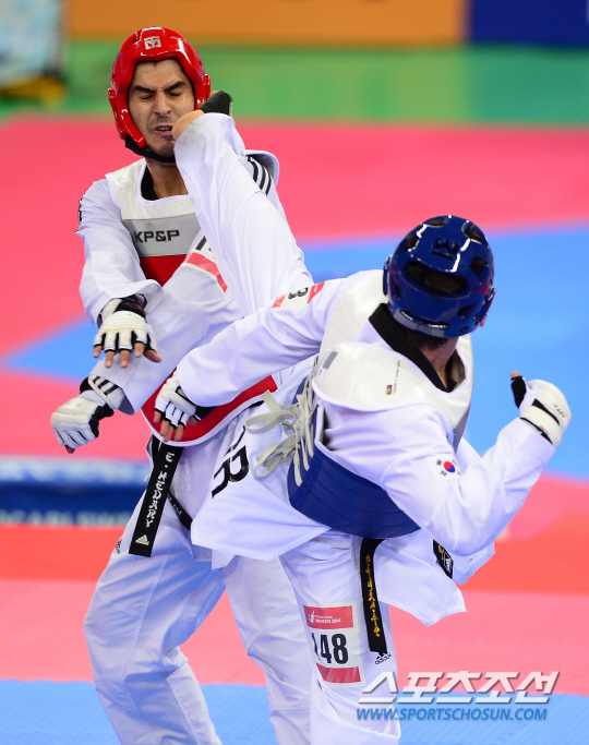 1일 오후 인천 강화고인돌경기장에서 2014 인천 아시안게임 태권도 남자 87kg 4강전 한국 조철호와 레바논 엘헤다리의 경기가 열렸다. 한국 조철호가 공격을 시도하고 있다.