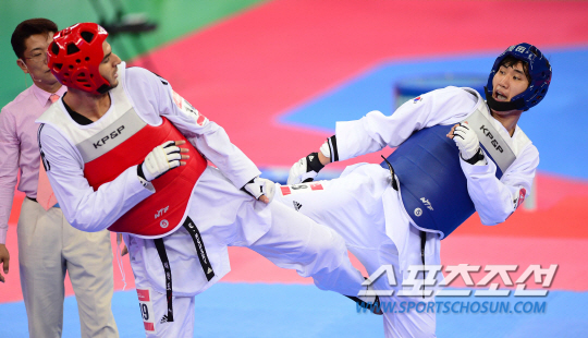 1일 오후 인천 강화고인돌경기장에서 2014 인천 아시안게임 태권도 남자 87kg 4강전 한국 조철호와 레바논 엘헤다리의 경기가 열렸다. 한국 조철호가 공격을 시도하고 있다.
